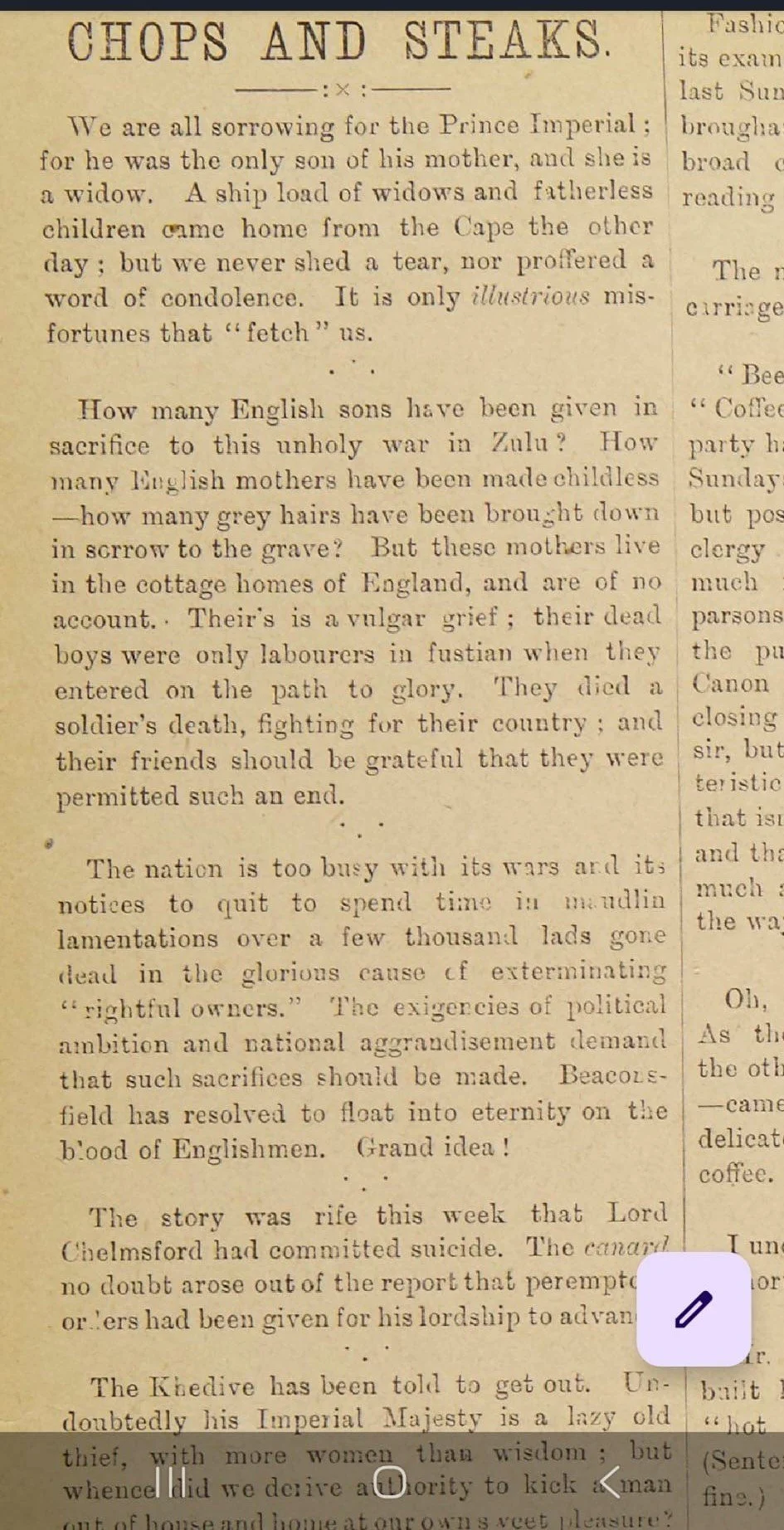 How many English sons have been given in sacrifice to this unholy war in Zulu? How many English mothers have been made childless -how many grey hairs have been brought down in sorrow to the grave? But these mothers live in the cottage homes of England, and are of no account. Their's is a vulgar grief; their dead boys were only labourers in fustian when they entered on the path to glory. They died a soldier's death, fighting for their country; and their friends should be grateful that they were permitted such an end.