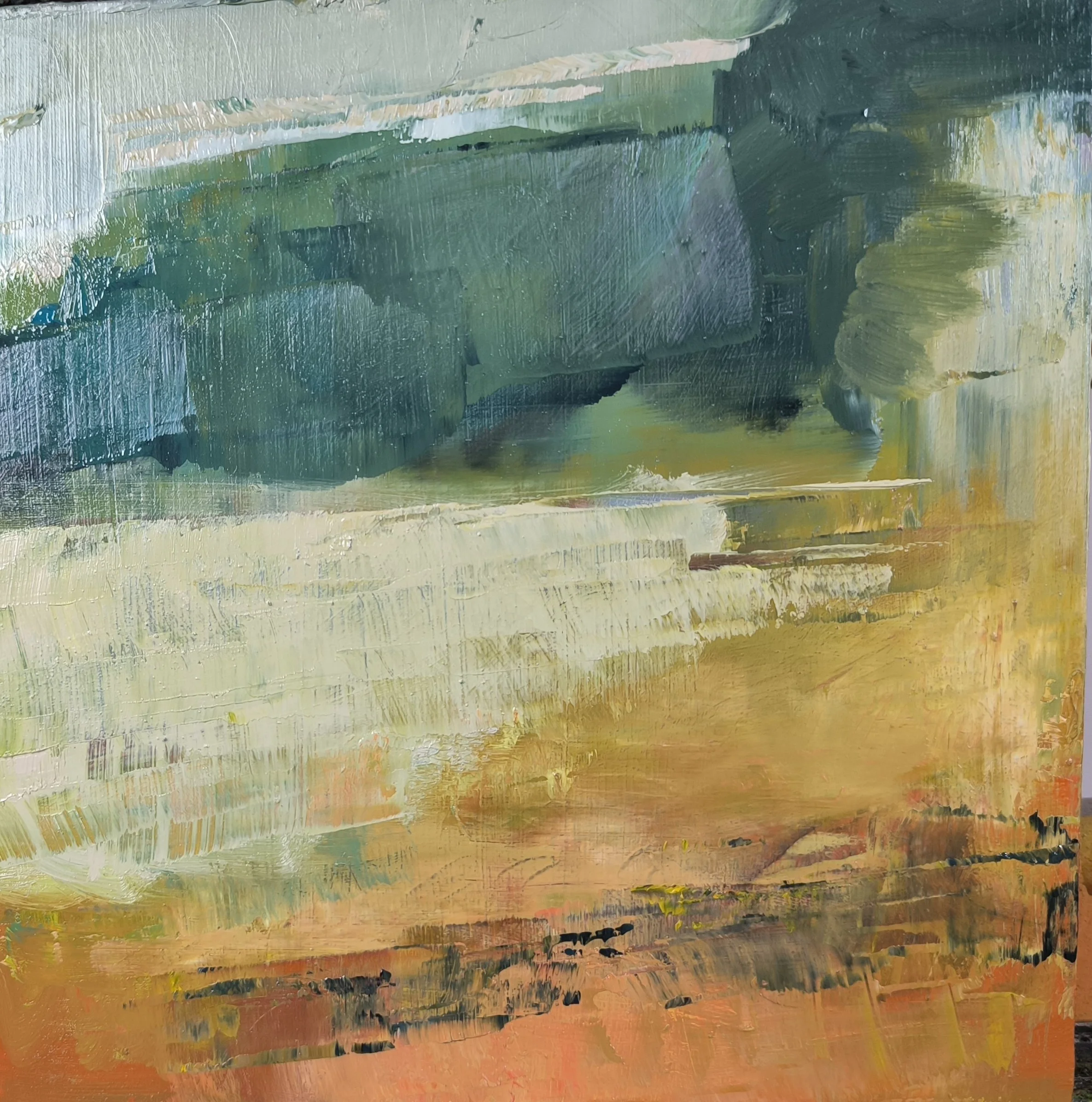 I am a Leamington based painter, working mainly in oils and a regular exhibitor at Warwickshire Open Studios, Leamington Studio Artists (LSA) and Association of Midland Artists (AMA). Originally I was inspired to paint in a traditional way, gleaning inspiration from the past, honing my drawing skills and use of oils, focussing particularly on still life and portrait painting. More recently I have been concerned to explore new directions. My work has become more expressive, interpretative and abstract. Finding my artistic ‘voice’ through landscape painting, gestural marks and capturing the emotion, elements and the forces of weather in my work. I have been influenced, for example, by the work of Scottish painter Joan Eardley and undertaking courses at the St Ives School of Painting and Lewis Noble has encouraged this new direction. The end result being semi abstract and gestural painting which has helped me to use more expressive brushwork and a different colour palette. My paintings aim to explore a sense of place rather than a direct representation, after all photographs can do that. Using pencil lines, slashes of colour and a fractured pictorial space helps with a sense of wildness and mood hopefully giving the viewer a new perspective.